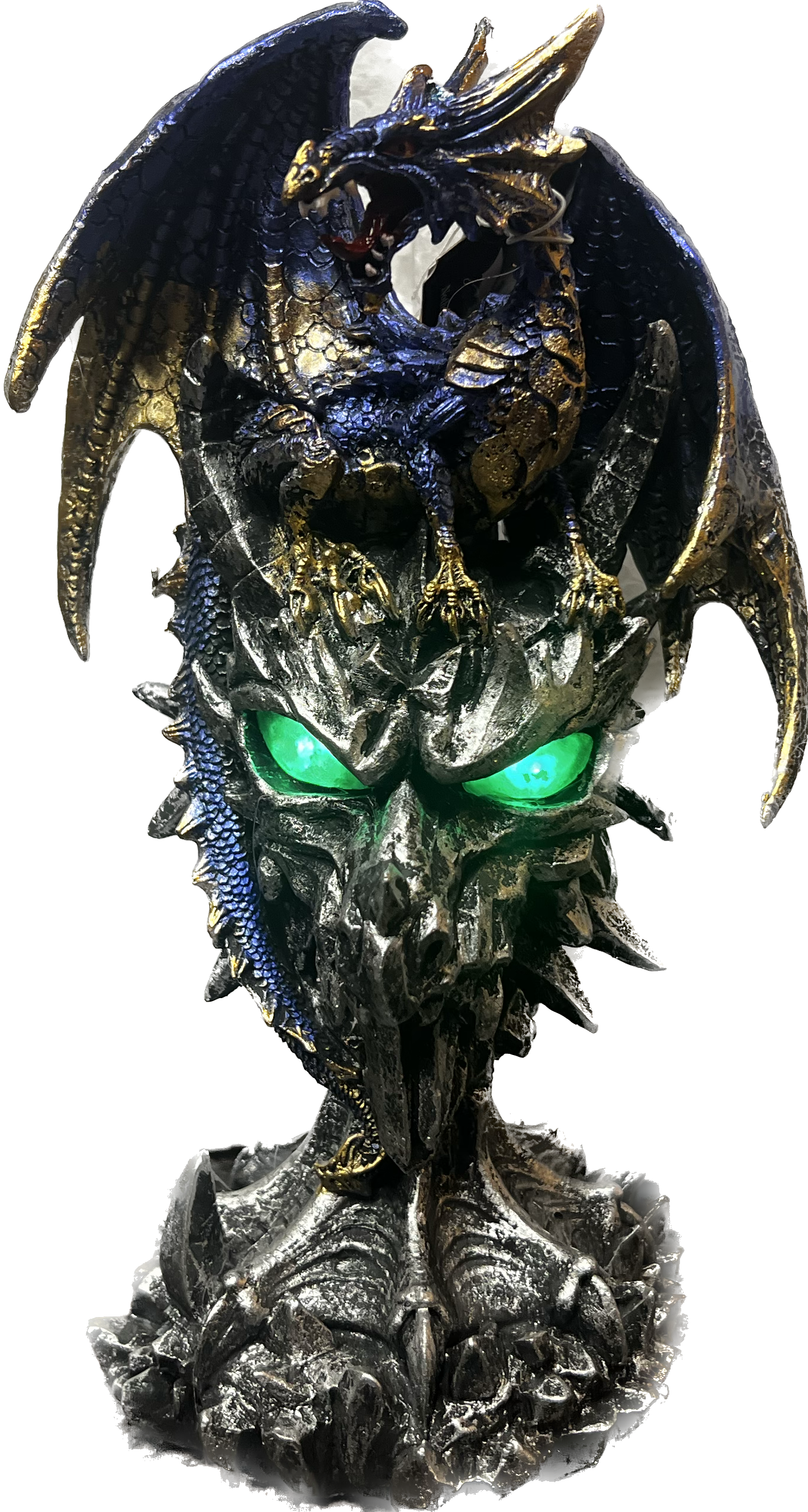 Adorn your home with this majestic Blue Dragon Warrior Statue. Crafted with intricate detail, the dragon's fiery red eyes, sharp jagged teeth, and metallic blue and gold accents will bring a sense of power and awe to any space. It's eye-catching design is further enhanced with LED lights in the base.