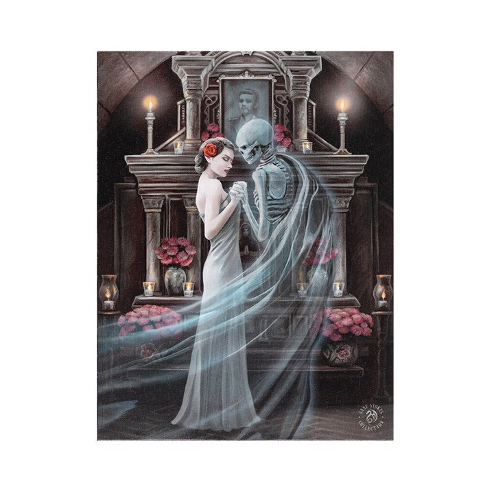 The Forever Yours Canvas Plaque by Anne Stokes celebrates the Day of the Dead and captures sacred moments with its precise attention to detail. Crafted from 19cm x 25cm canvas and 1.5 cm deep, this plaque features a framed portrait in the background as well as a praying statue stand-out between its two figures.