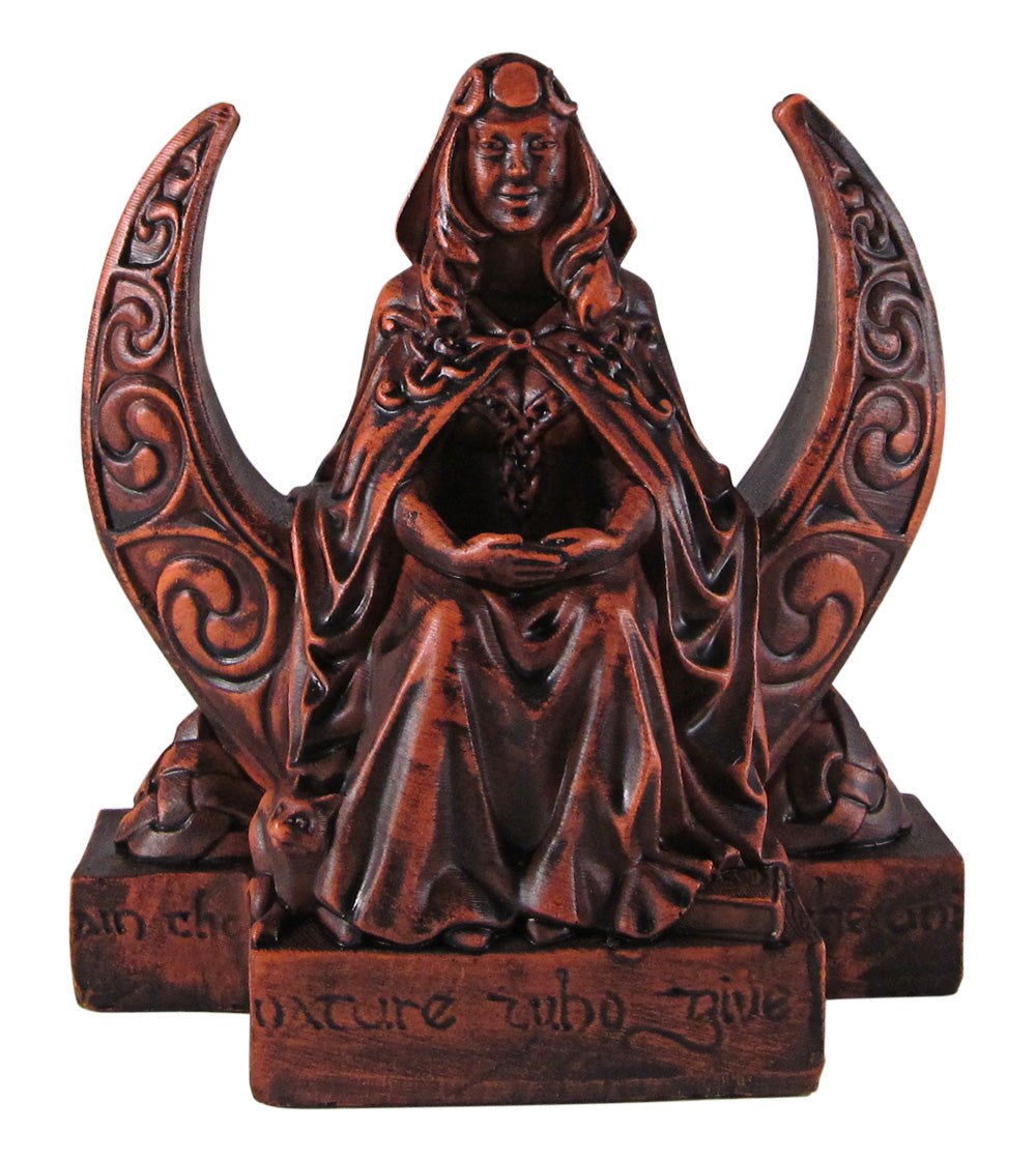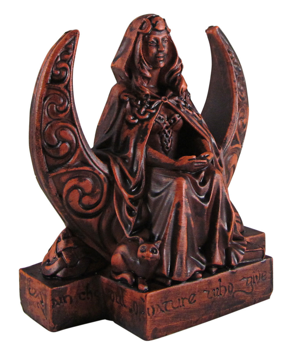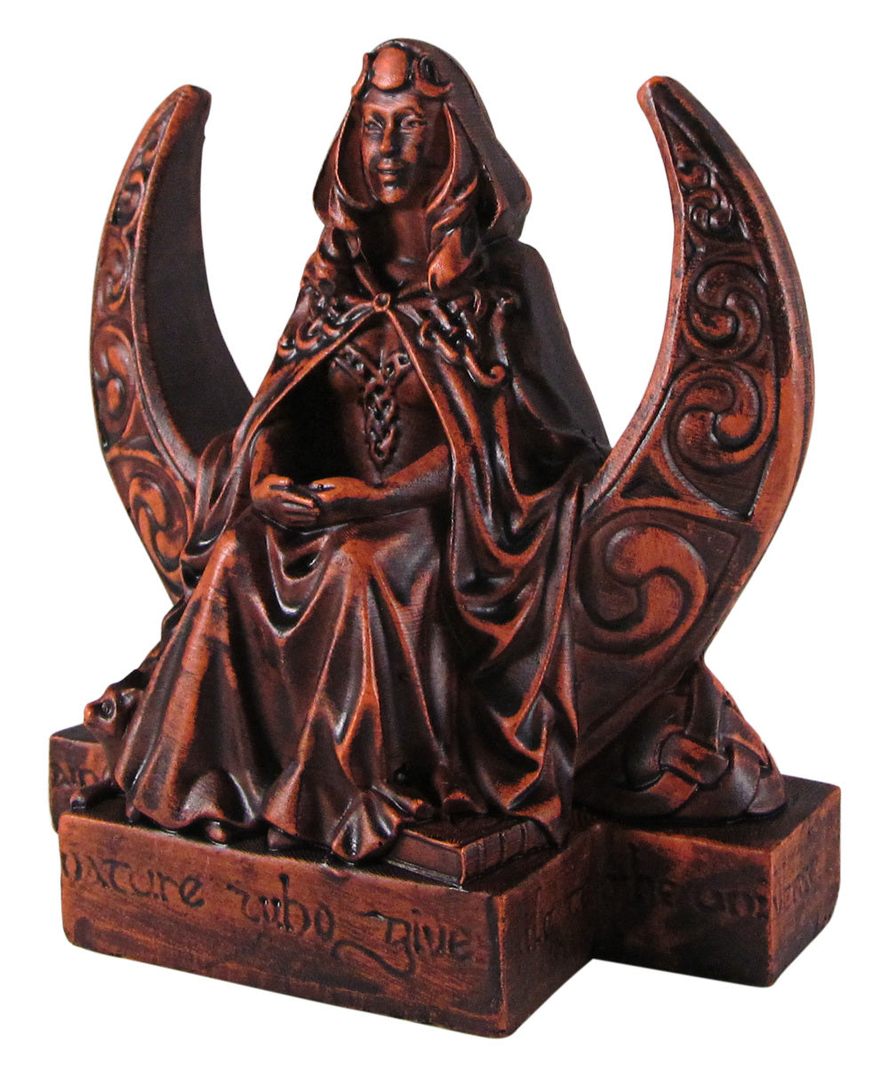 This Moon Goddess Figurine, inspired by the High Priestess card of the tarot, will add a powerful energy to any area. The 4-inch tall design is perfect for any altar, desk, or other space-limited sacred spaces. With its Wiccan Dryad design, you can place something precious within her arms to fill with her energy.