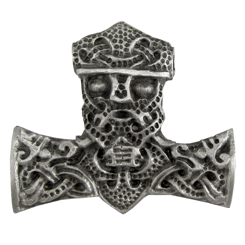 This lead-free pewter pendant is inspired by the Mammen Style Thor’s Hammer, famously found in Mammen, Norway. It features a depiction of Thor in a traditional pose, holding his beard with the two goats that pull his chariot. Perfectly sized at 1 16/17 inches wide, 1 3/4 inches tall and 3/8 inches deep. Comes on a braided leather rope that is approximately 14 inches in length.