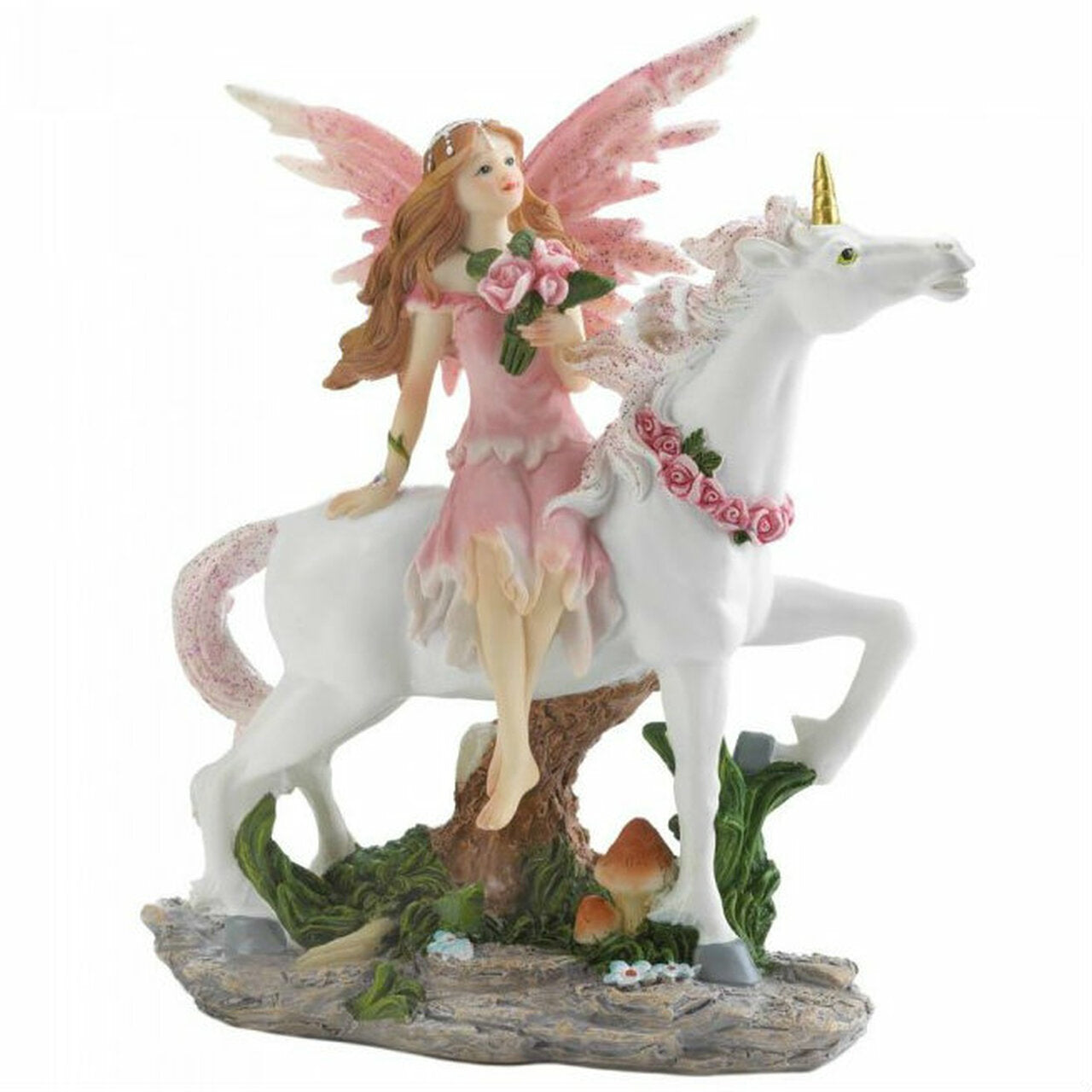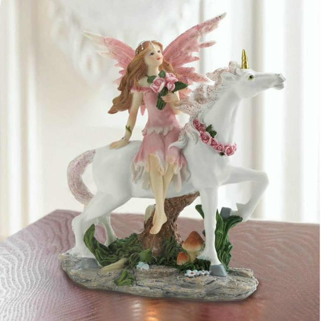 This Pink Fairy with Unicorn Figurine is an eye-catching piece of art. Featuring a pink-winged fairy sitting atop a mythical white unicorn adorned with pink roses, it measures 5 by 2.25 by 6.5 inches tall, making it a beautiful desk or shelf accessory. Perfect for fantasy lovers!