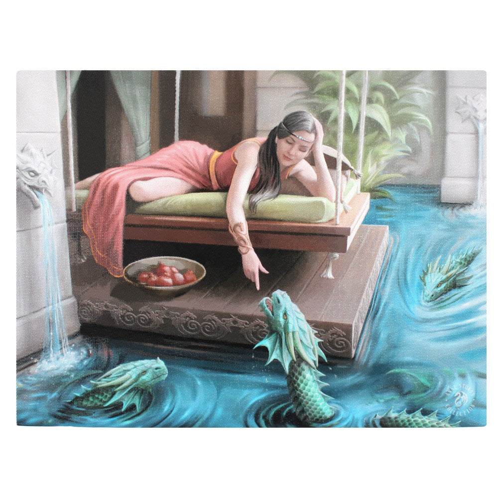 The Royal Court Canvas Plaque by Anne Stokes is a stunning wall feature with a 25cm by 19cm size. It features a dark-haired lady in a long red dress resting in an opulent setting. She is feeding pomegranates from a bowl to her dragons, a symbol of fertility, beauty, and eternal life in ancient mythology. Add a touch of elegance to your interiors with this unique and captivating design.