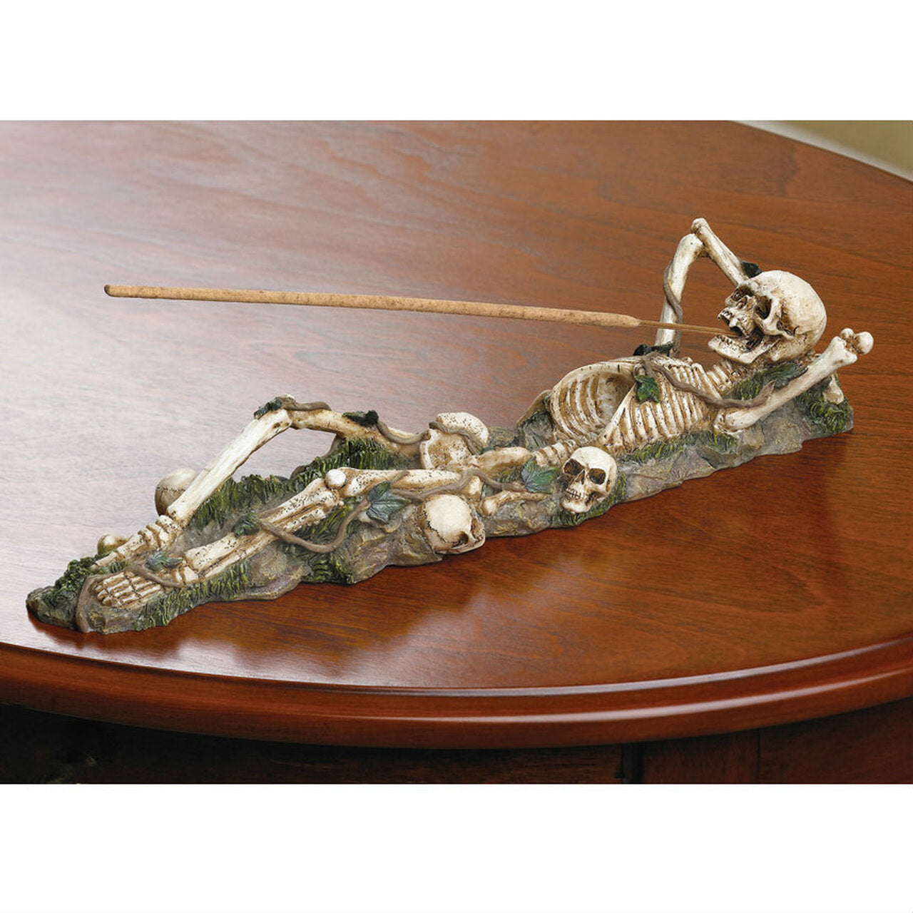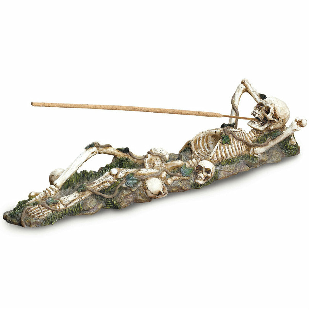 This Skeleton Incense Burner Holder is a unique piece of decoration perfect for any home. Its 10.5 inch size adds a subtle splash of style while the skulls and skeletal figure provide a spooky accent. Showcase your incense with a touch of horror.
