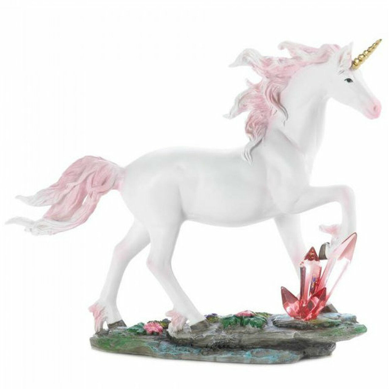 This Unicorn with Crystals Figurine is the perfect decorative piece for any home. Crafted from high-quality materials, this white unicorn comes complete with a golden horn, pink mane and tail, and is surrounded by crystalline and floral adornments. It measures a height of 8 inches, 2.25 inches in width, and 6.4 inches in length.